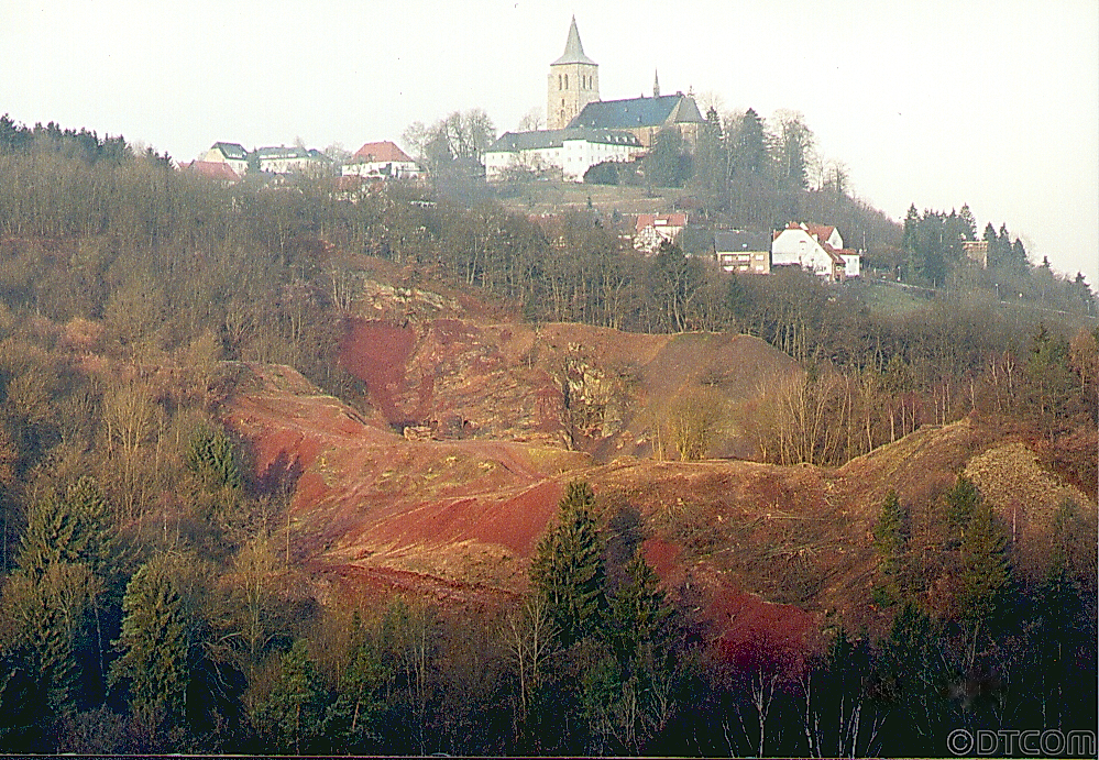 Auf dem Bild sieht man das offen im Tagebau lagernde Kieselrot unterhalb von Obermarsberg.